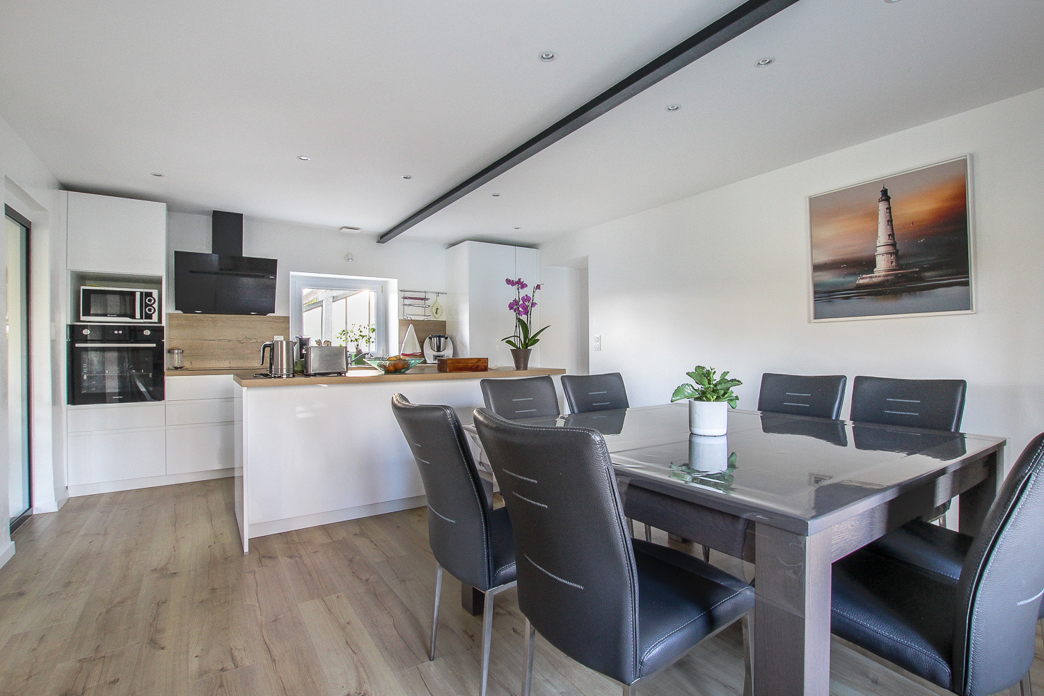 Elle se compose au rez de chaussée d'une entrée, une belle pièce de vie traversante avec poêle à bois, une salle à manger avec cuisine ouverte aménagée et équipée, deux chambres, une salle de bains (double vasque, baignoire d'angle, sèche serviette), wc séparé.